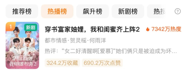 与此同时,红果短剧的热播榜上,《穿书富家妯娌,我和闺蜜齐上阵》系列的第二部也高居榜首。